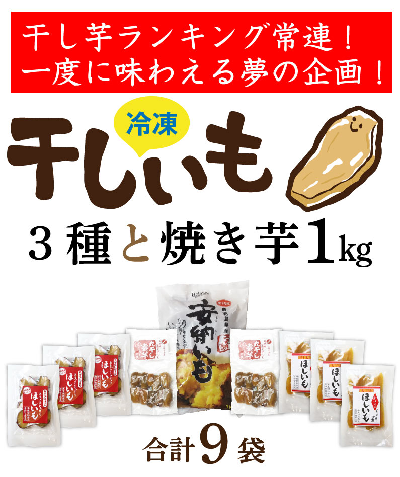 大人気干し芋をいつでもお手軽に!『冷凍干し芋3種と焼き芋1kg』 干し芋ランキング常連の「安納焼き芋(冷凍焼き芋)」・「丸ごと紅はるか(丸ごともっちり干し芋)」・「安納芋丸干し(丸干し蜜芋)」・「紅はるか平干し(紅はるか干し芋)」を一度に味わえる夢の企画!冷凍なので、食べたい時にさっと解凍して美味しくいただけます。