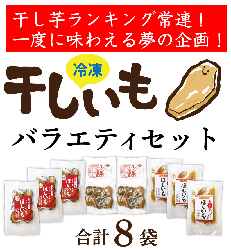 大人気干し芋をいつでもお手軽に!『冷凍干し芋バラエティセット』 干し芋ランキング常連の「丸ごと紅はるか(丸ごともっちり干し芋)」・「安納芋丸干し(丸干し蜜芋)」・「紅はるか平干し(紅はるか干し芋)」を一度に味わえる夢の企画!冷凍なので、食べたい時にさっと解凍して美味しくいただけます。