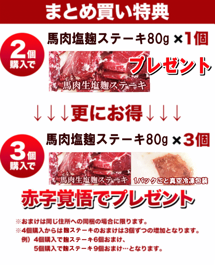 ギフト対応について ●6年連続グルメ大賞![2009~2015] 【2個購入で馬肉塩麹ステーキ80g×1個!3個購入で馬肉塩麹ステーキ80g×3個おまけ!】※不正購入と判断した場合にはご注文を取り消しさせて頂く可能性がございます。