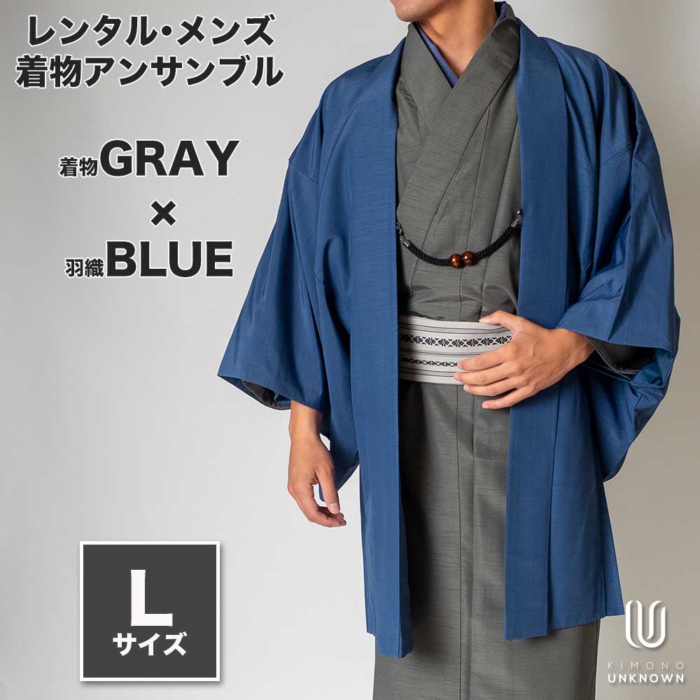 【レンタル】メンズ着物アンサンブル【対応身長170cm〜180cm】【 Lサイズ】フルセットー着物グレー×羽織ブルー 往復送料無料 和服 お正月 初詣 和装 男性用 紳士用